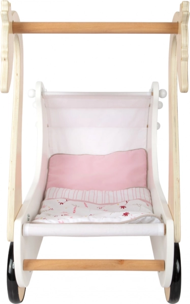 Decorato in colori delicati e forme semplici, questo passeggino per bambole accompagna la loro cura quotidiana. Grazie alla sua robusta costruzione può ospitare bambole fino a 46 cm. Il passeggino è dotato di tettuccio in tessuto retrattile e nella confezione troverai un set di biancheria da letto floreale rosa e bianco in due pezzi. Le ruote gommate garantiscono un movimento silenzioso e fluido su qualsiasi superficie, mentre la struttura realizzata con precisione in legno massiccio e compensato offre una lunga durata.