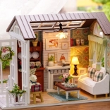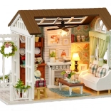Il set contiene tutto il necessario per costruire il soggiorno e il suo arredamento, compresa la colla e istruzioni illustrate dettagliate. L’illuminazione LED, inclusa nella confezione, alimentata a batterie (2x AAA 1,5V e 3x 1,5V LR54 - batterie non incluse), valorizza magnificamente l’atmosfera complessiva.