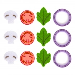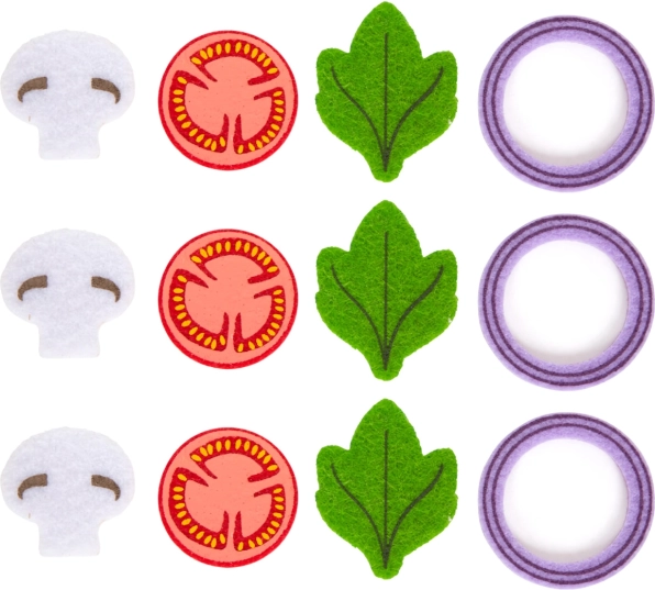 Il set include 12 riproduzioni in feltro di ingredienti come funghi, pomodori e cipolle, offrendo ai bambini l'opportunità di preparare diversi piatti.