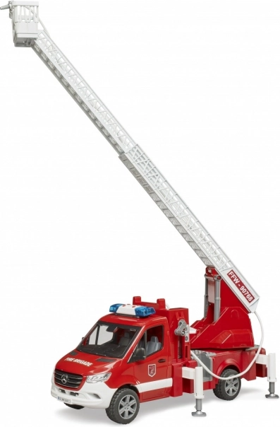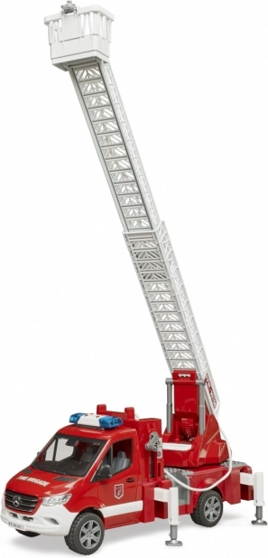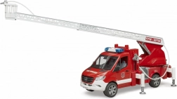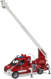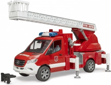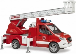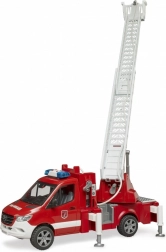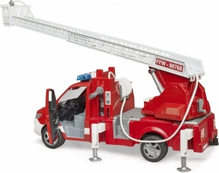 La scala è estensibile e può essere ruotata, mentre i piedini stabilizzatori garantiscono sicurezza durante il gioco. Il veicolo dispone di un armadietto aperto che può essere utilizzato per riporre attrezzature aggiuntive da pompiere. La cabina è compatibile con le figurine della collezione BRUDER BWORLD.