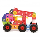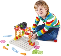 Viti, dadi e piastrine forate si collegano facilmente e tengono bene. I bambini possono costruire auto, trattori, gru e modelli personalizzati – in modo semplice e sicuro.