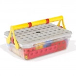 Tutti i pezzi si ripongono nella solida scatola con manico. Il coperchio perforato funge da superficie di costruzione – ideale a casa e in viaggio.