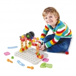 Il coperchio della valigetta funge da base di costruzione, così i bambini possono giocare a casa e fuori. Gli elementi colorati attirano l’attenzione, supportano l’apprendimento attraverso il gioco e sviluppano pensiero tecnico e creatività.
