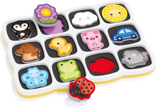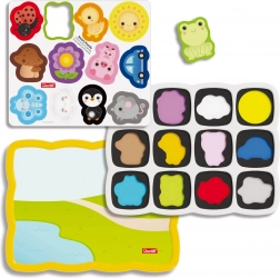 Contiene 12 pezzi magnetici colorati che aiutano i bambini ad imparare colori e forme in modo divertente.