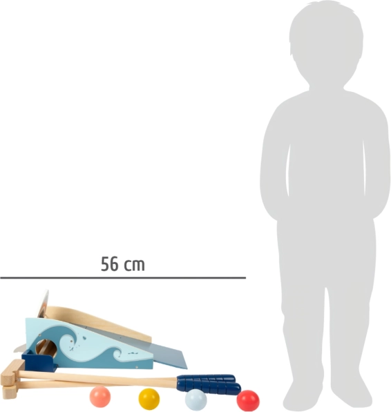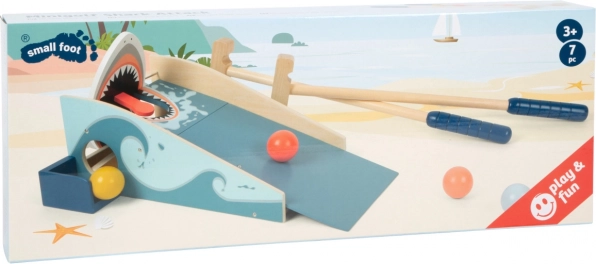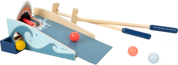 Divertente gioco di minigolf in legno con squalo che motiva i bambini al movimento e sviluppa la loro coordinazione. Invia la pallina sull’“onda” direttamente nella bocca – quando colpisci il bersaglio, le mascelle si chiudono con effetto e la pallina torna in gioco attraverso l’apertura. Inclusi 2 mazze e 4 palline colorate in legno resistente.