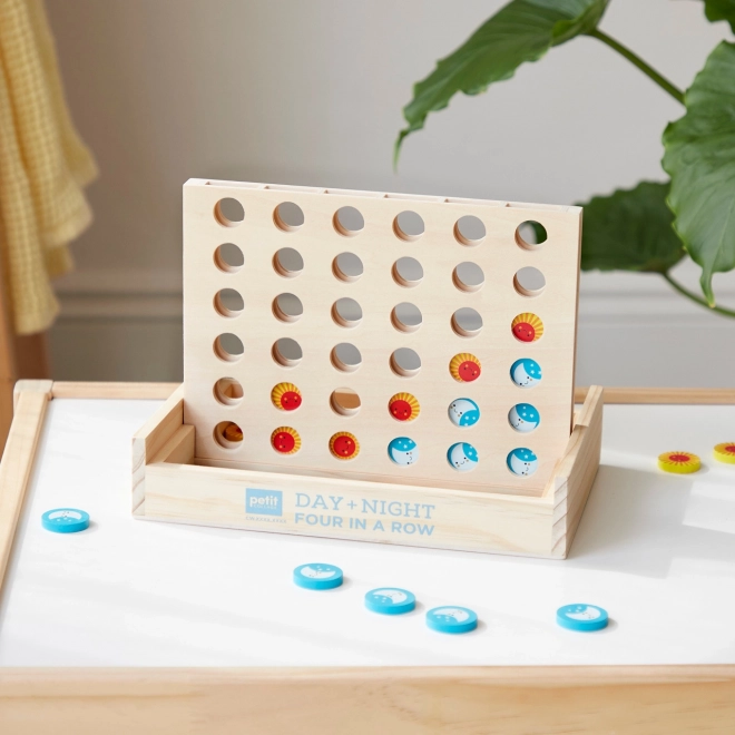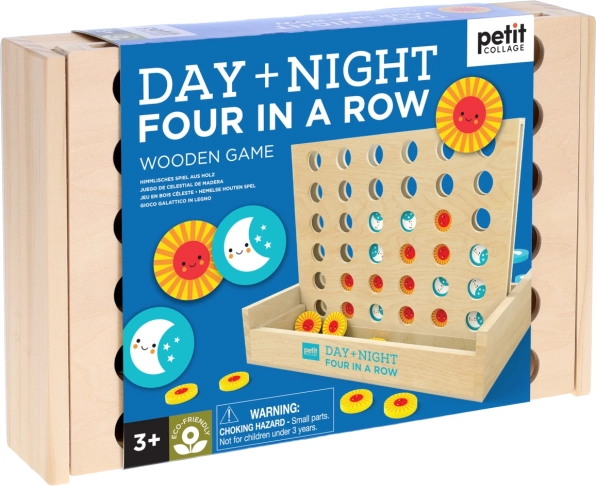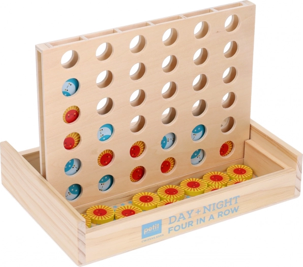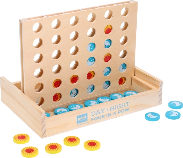 Il gioco in legno Quattro in fila giorno e notte richiede ai giocatori non solo riflessi pronti, ma anche capacità di pianificazione strategica. L'obiettivo è posizionare quattro gettoni consecutivi sulla griglia. I gettoni hanno un design attraente di sole e luna che attira e delizia giocatori grandi e piccoli.