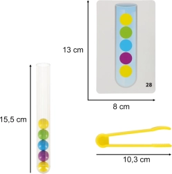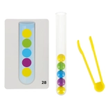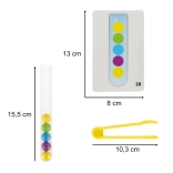 Scopri un modo divertente e interattivo per sostenere le abilità del tuo bambino con questo grande set educativo. Il gioco si concentra su ordinare le palline nei cilindri corretti utilizzando le mani o le pinze incluse.
