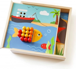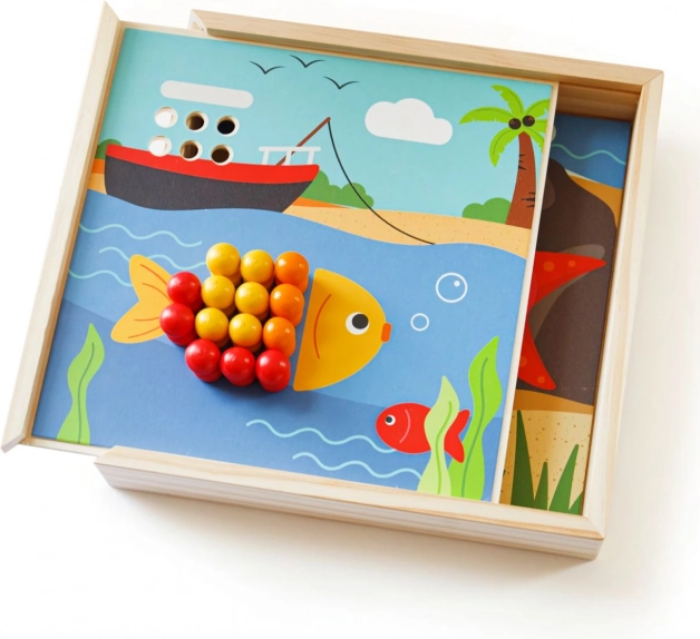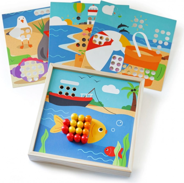 Scopri un divertente mosaico a tema spiaggia che stimola l'immaginazione e le abilità dei bambini. Include 4 immagini e 96 piolini in 8 colori, che i bambini inseriscono sul coperchio della pratica scatola. Il gioco favorisce il riconoscimento dei colori, la motricità fine, la concentrazione e il pensiero logico. Realizzato in legno di alta qualità, proveniente da fonti responsabili – piacevole al tatto e ideale per i viaggi.