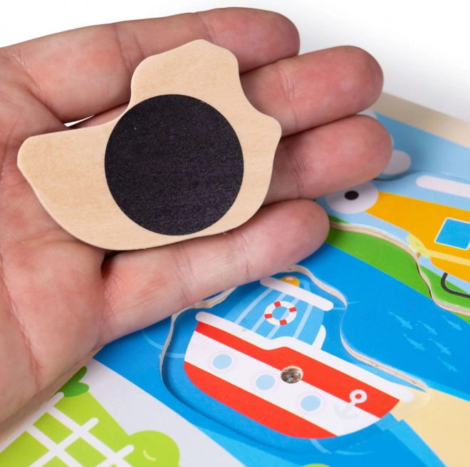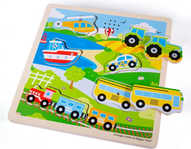 Puzzle di legno divertente per i bambini con tema dei mezzi di trasporto, che una volta posizionato il pezzo nel posto giusto riproduce un suono caratteristico di quel mezzo, aiutando così a sviluppare le capacità cognitive del bambino.