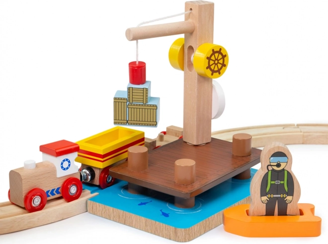 Questo set portuale dona alla tua ferrovia un’atmosfera realistica. La gru magnetica funzionale trasferisce in sicurezza il carico tra il molo, i vagoni e la barca, mentre la figurina del subacqueo è pronta per ogni missione di salvataggio. La robusta struttura in legno garantisce lunga durata e gioco sicuro.