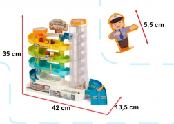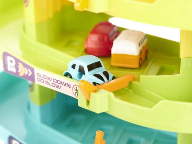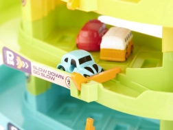 Porta le macchinine sul tetto con la pressione di un pulsante – l’ascensore è accompagnato da luci e una melodia allegra. In caso di necessità si può azionare manualmente, così il gioco non finisce mai.