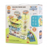 Base con ascensore, 6 macchinine, 3 piani a forma di “U”, 1 curva “C”, 4 strade dritte, 1 rampa dall’ascensore, 1 uscita dal parcheggio, 2 set di decorazioni in plastica, 1 set di adesivi