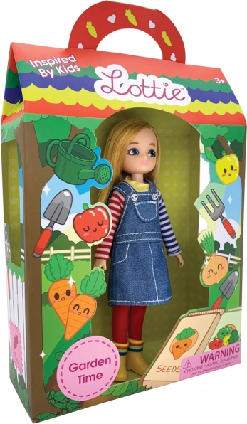 - Bambola LOTTIE giardiniera, cardigan a righe, abito in denim, collant rossi, stivali di gomma gialli, paletta, rastrellino, annaffiatoio, 2 scatoline