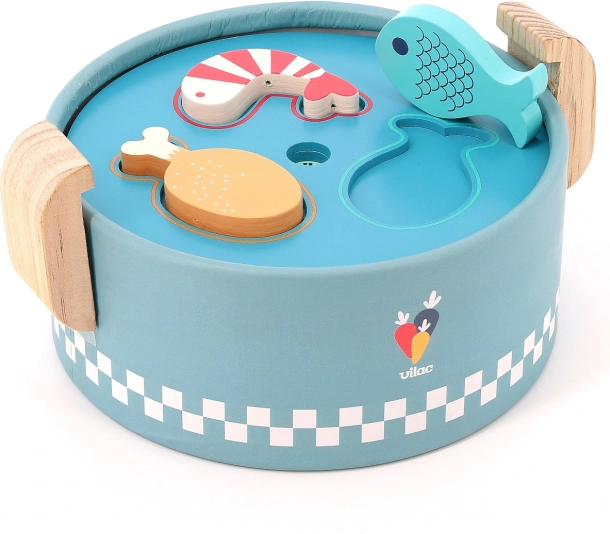 - pentolino blu con dettagli in legno, ingredienti colorati