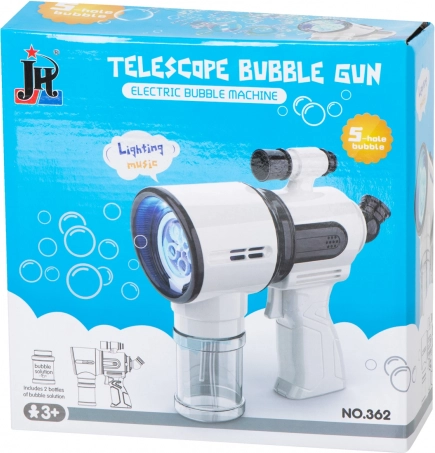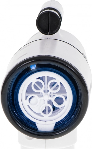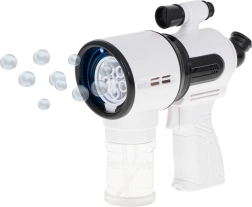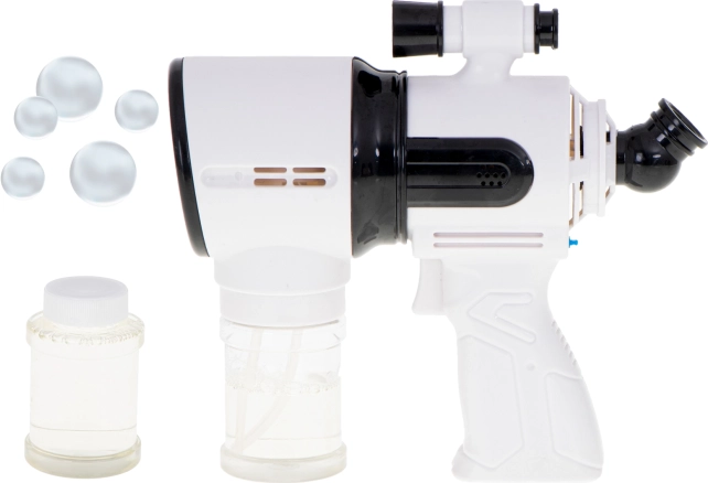 Questa pistola per bolle bianca è ideale per bambini dai 3 anni e per eventi all’aperto in famiglia. La ventolina integrata e il sistema a 5 anelli assicurano un soffio continuo e un flusso di decine fino a centinaia di bolle con una sola pressione del grilletto. Per un divertimento ancora maggiore non mancano illuminazione LED e suoni, attivabili o disattivabili con un unico pulsante.