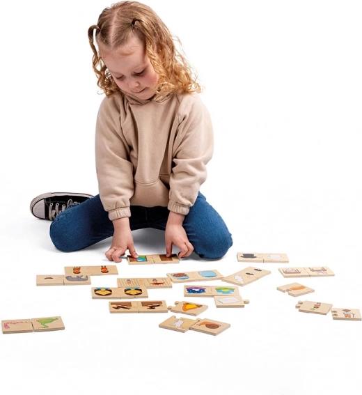 I bambini abbinano le immagini che appartengono tra loro come significati opposti – ad esempio giorno e notte, caldo e freddo, triste e allegro. I pezzi lisci e robusti si impugnano e si posano facilmente, così le piccole mani possono concentrarsi sulla scoperta di nuove parole e connessioni.