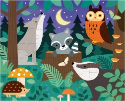 Scoprite la magia del bosco notturno con animali come procione, gufo e tasso.
