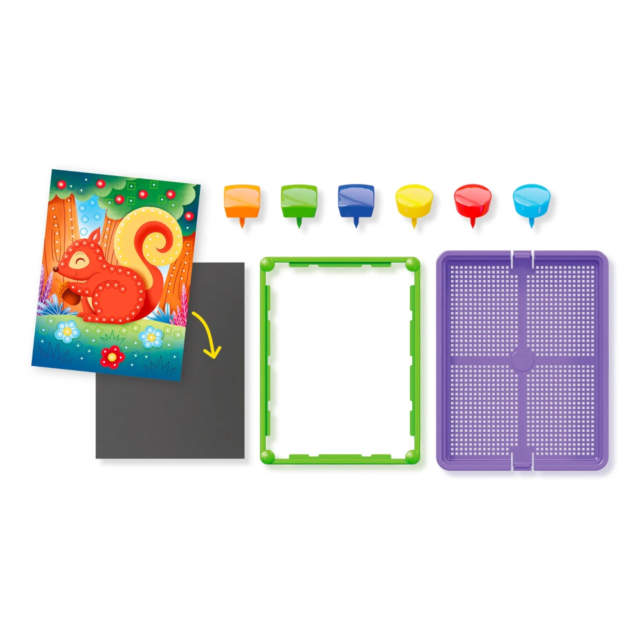 Questo colorato mosaico a pioli entusiasmerà i bambini con la possibilità di creare immagini sia dalle schede predefinite sia dai propri disegni. Grazie all’inserimento intuitivo dei pioli nella base, i bambini allenano la presa, la pazienza e la percezione visiva. I robusti componenti in plastica e la cornice assicurano stabilità e un trasporto agevole.