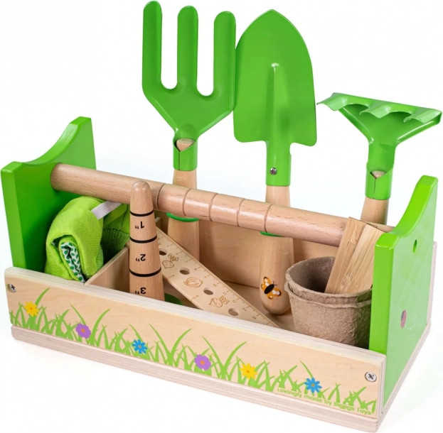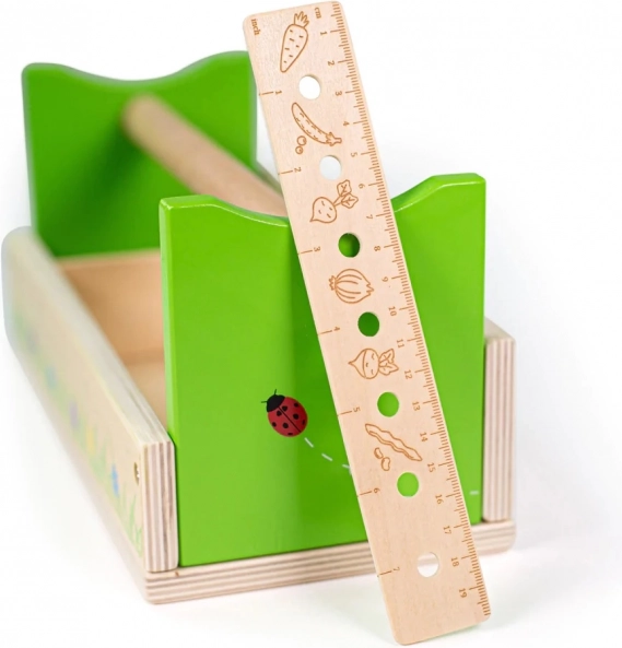 Questo colorato set da giardinaggio sviluppa la manualità, la pazienza e il rapporto con la natura. Il tutto è riposto in una robusta cassetta di legno dal fresco design verde con coccinelle e fiori. I bambini possono provare in sicurezza a piantare, smuovere o misurare, imitando gli adulti.