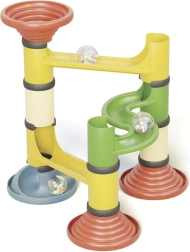 Con questo set unico, i bambini possono costruire rapidamente e intuitivamente diverse piste per biglie grazie alla facile connessione. Tutte le parti sono realizzate in bioplastica innovativa, che combina fibre di legno e plastica. Questa scelta ecologica riduce significativamente le emissioni di CO2 durante la produzione e i materiali sono 100% riciclabili. Il giocattolo non solo appare e profuma come il legno, ma resistente e piacevole al tatto.