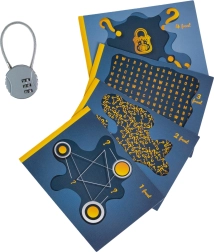 Nella confezione trovi tutto il necessario: scatola, lucchetto, 4 carte indizio, 3 fogli di adesivi decorativi e 5 etichette scrivibili per la personalizzazione. Il vano interno di 11,5 × 11,5 × 10,5 cm ospita un piccolo regalo, un buono o un messaggio personale. Prodotto nell’UE e corredato da istruzioni illustrate in inglese e tedesco.