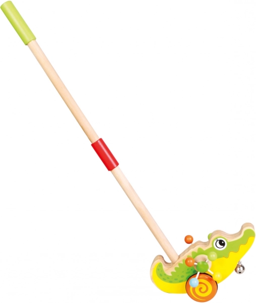 Giocattolo in legno di alta qualità, molto apprezzato, con design a coccodrillo. Coccodrillo su bastone con campanellino, emette suoni durante il movimento. Un giocattolo che il bambino può spingere davanti a sé, aiuta a sviluppare le abilità motorie. I bambini imparano anche in questo modo a distinguere colori e animali. Il camminatore ha ruote gommate per un funzionamento silenzioso. I bambini possono spingerlo o tirarlo sia in casa che all’aperto. Un bel regalo per il tuo bambino. Caratteristiche principali: supporta il bambino nei primi passi, divertente e adorabile, sviluppa le abilità motorie