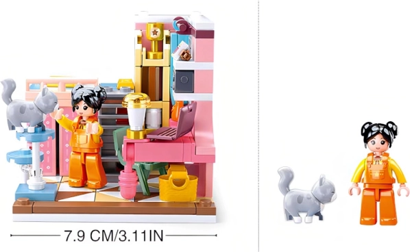 Costruisci una mini camera da letto dettagliata della popolare serie Sluban Girls Dream. Con 210 pezzi realizzerai una scena originale con accessori e 2 minifigure con parti girevoli e basculanti. Grazie alla compatibilità con LEGO, Cobi e Mega Bloks potrai ampliare facilmente l’universo del tuo set.