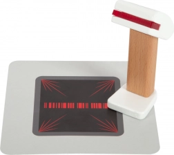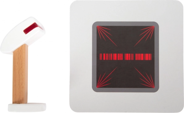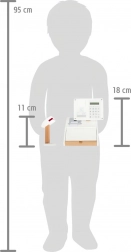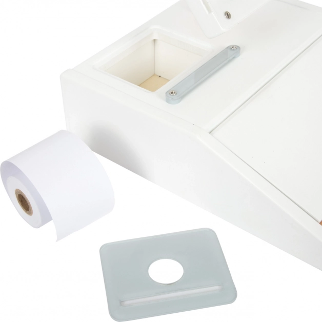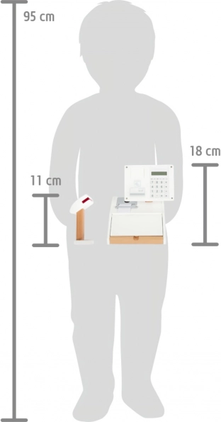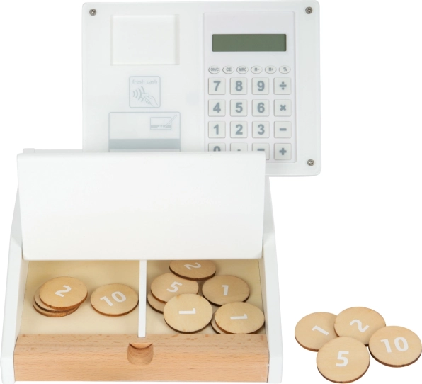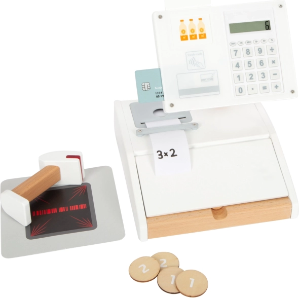 Il set include card prodotto, lettore di codici a barre, rotolo di scontrini a strappo, scanner e 15 monete in legno bifacciali. La combinazione di legno e plastica assicura resistenza e un gradevole design nordico con venature del legno a vista. La cassa favorisce l’apprendimento del calcolo, lo sviluppo della fantasia e l’interazione sociale nel gioco del negozio.
