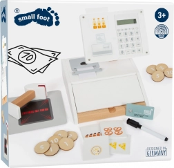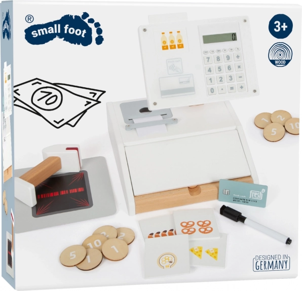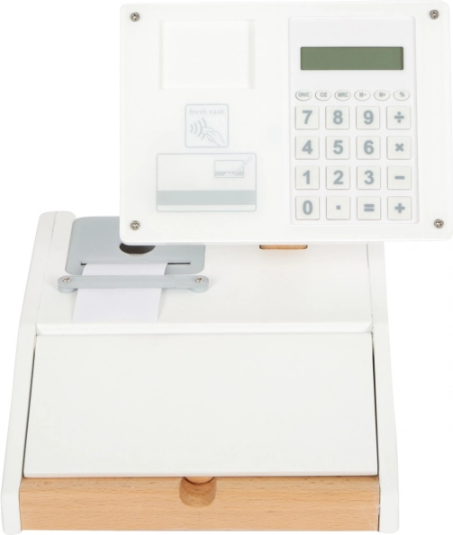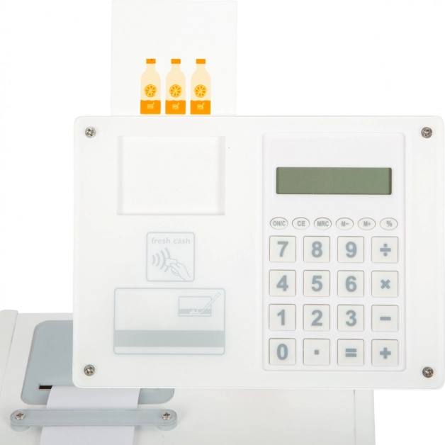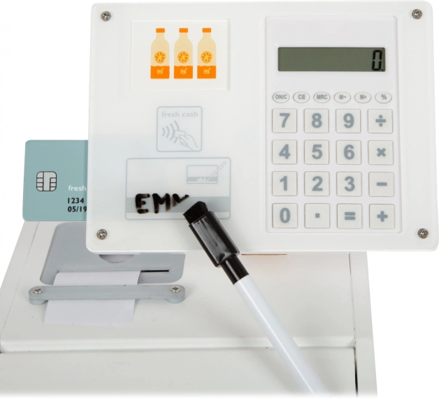 La cassa registratrice in legno SMALL FOOT Fresh trasforma ogni angolo dei bambini in un piccolo supermercato. Grazie alla calcolatrice integrata nel monitor girevole i bambini calcolano facilmente la spesa, aprono il grande cassetto con scomparti per le monete e provano il pagamento cashless con la propria carta e firma sul plexiglass.