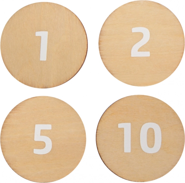 Le monete in legno bifacciali e le carte prodotto aiutano i bambini a esercitare il calcolo, il riconoscimento dei valori e le basi dell’educazione finanziaria in modo giocoso.
