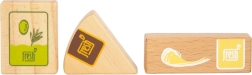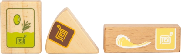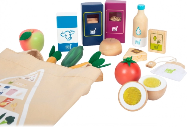 Il set di alimenti vegetariani Fresh offre ai bambini tutto ciò di cui hanno bisogno per giochi creativi da cucina e da negozio. I pezzi in legno come latte, burro, formaggio, olio, uova, riso, pasta, prodotti da forno, mela, pomodoro, cetriolo e carota sono completati da una bottiglia d’acqua e una bustina di tè. I dettagli realistici, inclusa la finestrina nelle confezioni di riso e pasta (emettono suono quando vengono scossi), aumentano l’attrattiva e l’autenticità del gioco.