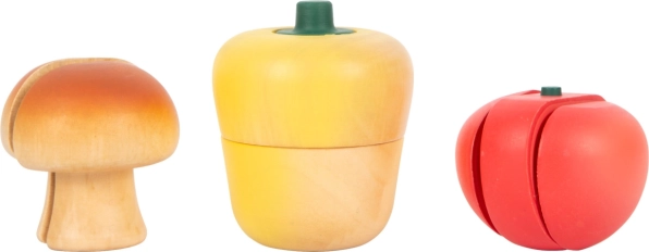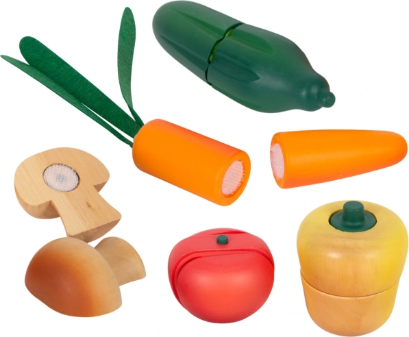 Pomodoro, peperone, cetriolo, carota e fungo champignon sono divisi a metà e tengono insieme grazie alla chiusura a strappo – ideali per esercitarsi a tagliare in sicurezza.