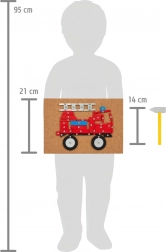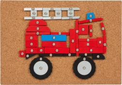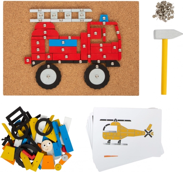 Set di gioco creativo completo a tema trasporti, che include una base in sughero, un martello in legno e molti pezzi in legno di varie forme e colori. Aiuta a sviluppare creatività, abilità manuale e coordinazione occhio-mano.