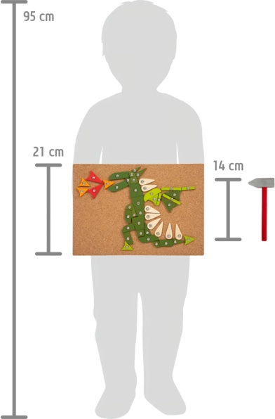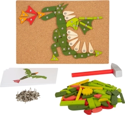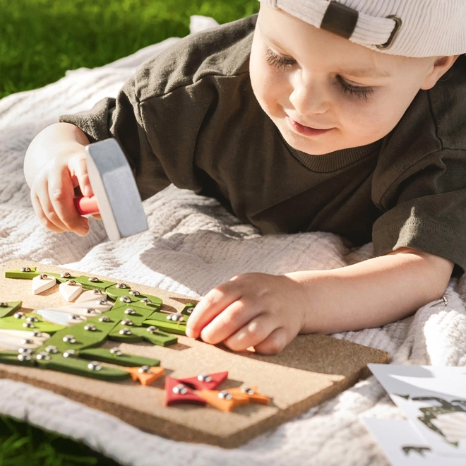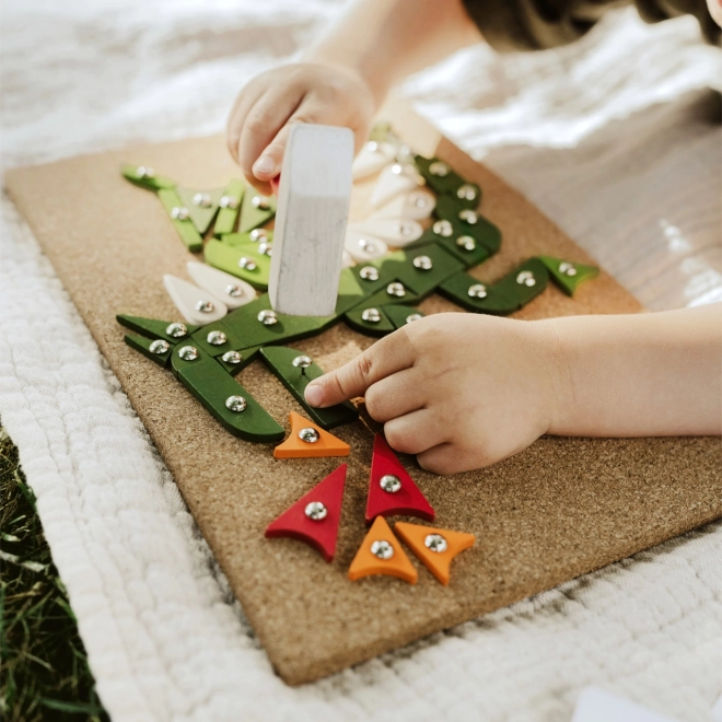 Gioco di martellamento creativo per bambini, che sviluppa la loro fine motricità e creatività. Il set include una base in sughero, un martello in legno e vari pezzi in legno colorati.