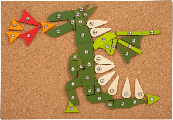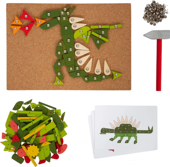 Il set include una base in sughero, un martello in legno, pezzi colorati e puntine per creare immagini.