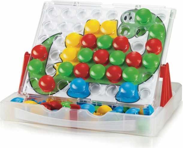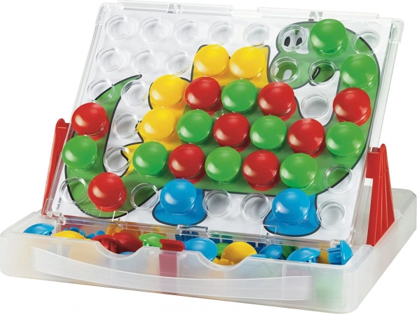Il mosaico in una pratica valigetta permette ai bambini di comporre allegre immagini seguendo le schede incluse o la propria creatività. La tavoletta può essere inserita nei supporti e usata anche in posizione verticale per un gioco ancora più comodo. I grandi pioli colorati sono sicuri e facili da afferrare anche per le mani dei più piccoli.
