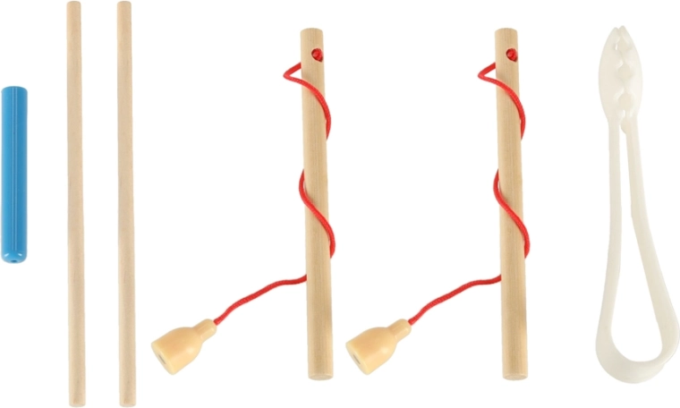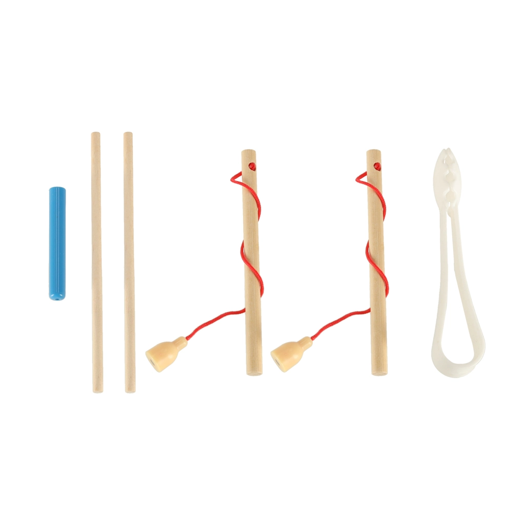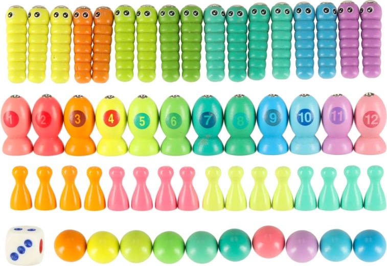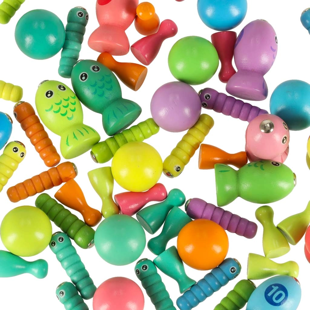 - 1× base in legno, 2× canna, 2× bacchette, 1× pinzetta, 4× ciotolina in silicone, 10× biglia in legno, 12× pesciolino, 17× bruco, 16× pedina in 4 colori, 1× dado