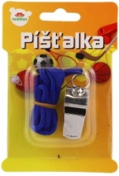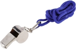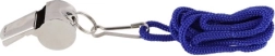 Questo fischietto di metallo di colore argento lucido è progettato per una chiara proiezione del suono, rendendolo adatto per un uso sportivo o di emergenza. Viene fornito con un cordino blu in tessuto, che permette una comoda portabilità al collo. Ideale per allenatori, arbitri, così come per eventi familiari.