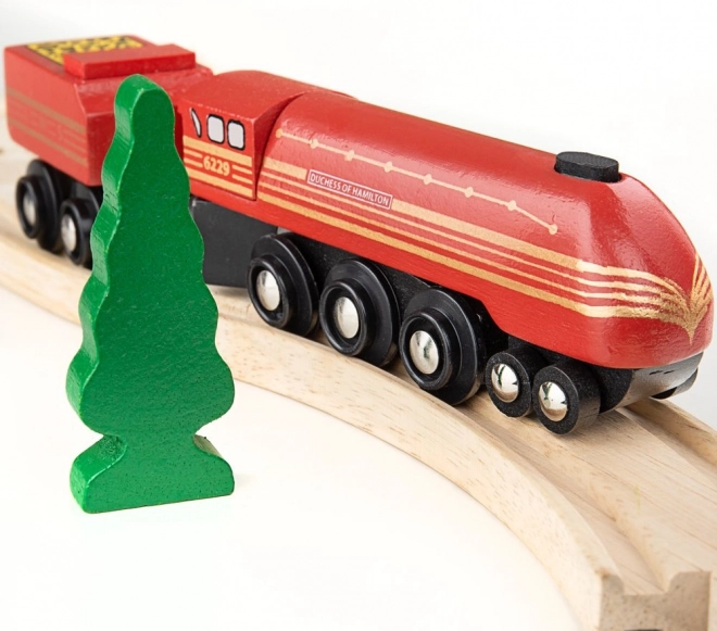La locomotiva “Duchess of Hamilton”, ricca di dettagli e con ruote in metallo, entusiasmerà tutti gli amanti dei treni storici e impreziosirà ogni pista in legno.