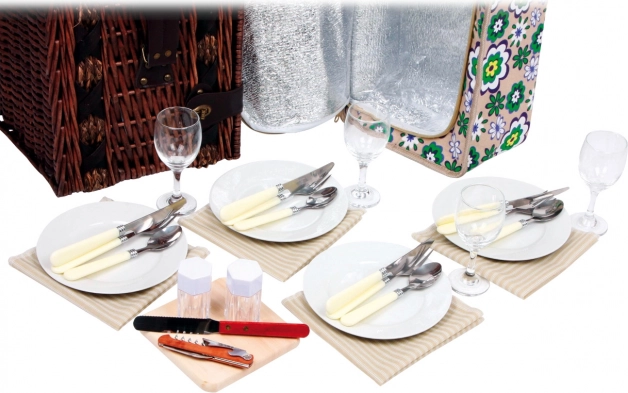 Il cesto contiene tutto il necessario per un picnic con la famiglia o gli amici: piatti, posate, calici da vino, coltello, pepiera, saliera e tovaglioli.