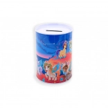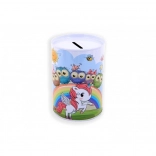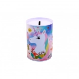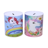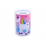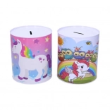 Il salvadanaio è decorato con allegre illustrazioni di unicorni, che aggiungono un tocco giocoso a ogni stanza dei bambini.