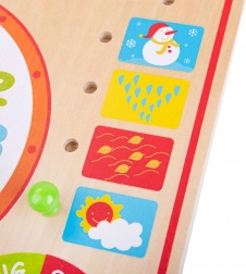 La tavola è chiara e ordinata, include un grande orologio con lancette mobili, indicatori rotanti o scorrevoli per giorni, mesi, meteo e stagioni. Le etichette di base sono in inglese, così il bambino acquisisce naturalmente anche un piccolo vantaggio linguistico. Il prodotto è realizzato in legno resistente e proveniente da fonti responsabili, adatto all'uso quotidiano in casa e in asilo.
