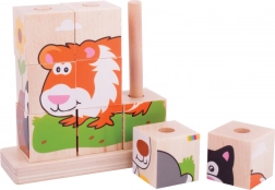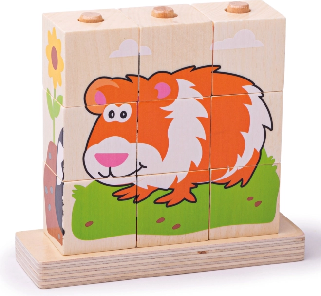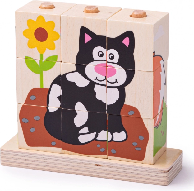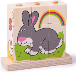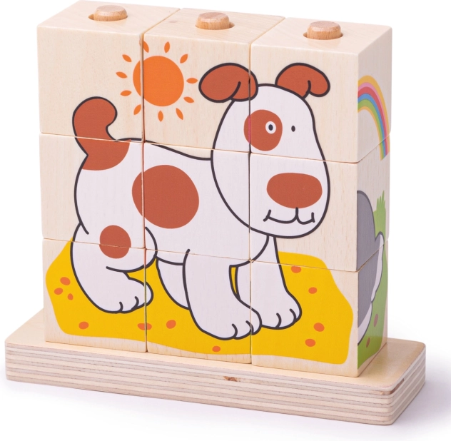 Il set comprende in totale 10 pezzi – 9 cubi, con cui creare 4 immagini diverse, e una base in legno con perni per un gioco sicuro e ordinato. Il giocattolo è realizzato in legno resistente con superficie liscia ed è conforme alle norme di sicurezza europee attuali.