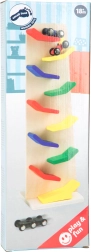Questa torre a cascata in legno di alta qualità offre ai bambini infinite dosi di divertimento dinamico. Basta posare la piccola auto articolata in cima e osservare come scende lungo le singole rampe creando il caratteristico “clap clap”. Il gioco stimola vista, udito e coordinazione mano-occhio.