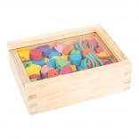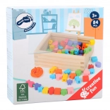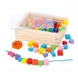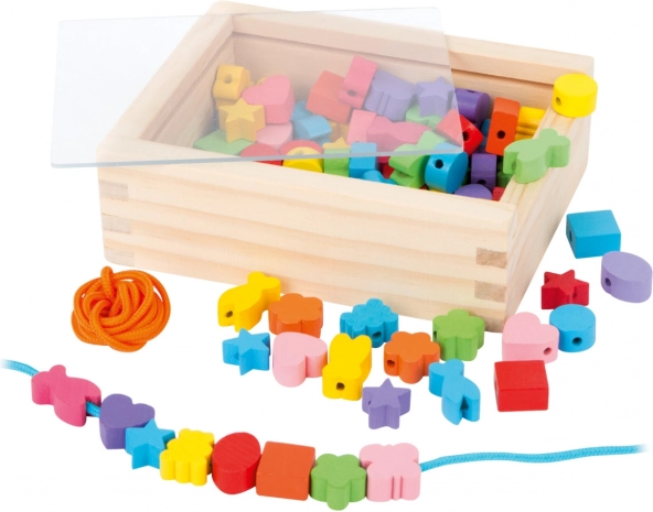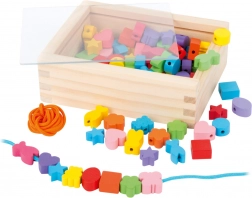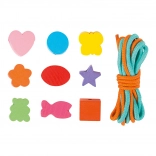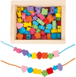 I piccoli creatori possono godere di ore di divertimento con questo set in legno. La scatola contiene 81 perline colorate e 2 lacci, che permettono ai bambini di creare gioielli variati secondo le loro idee.