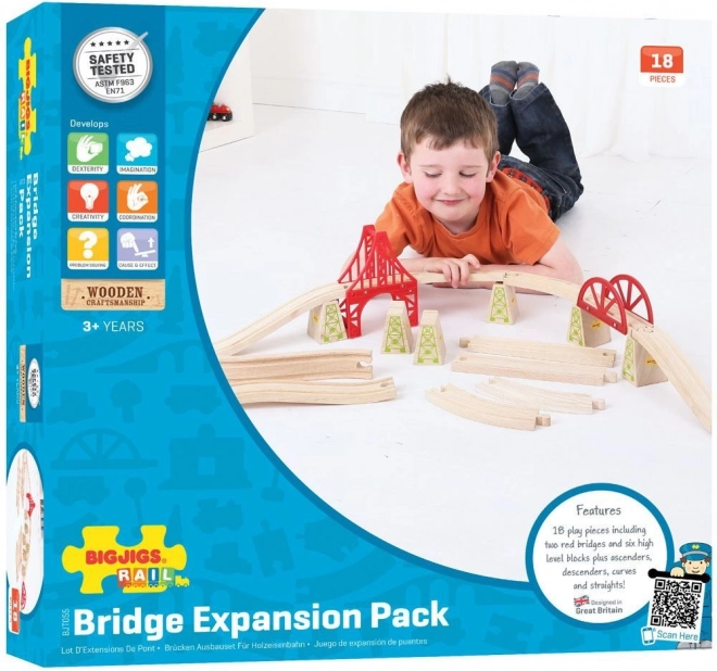 Amplia la tua ferrovia in legno con un set ponte universale da 18 pezzi che aggiunge nuove altezze e avventure al gioco. Il set include binari in salita e discesa, supporti e elementi di ponte per superare facilmente gli ostacoli. È pienamente compatibile con la maggior parte delle ferrovie in legno ed è realizzato in legno di qualità. Compatibilità, materiali di qualità, gioco sicuro e sviluppo dell'immaginazione e della motricità fine.