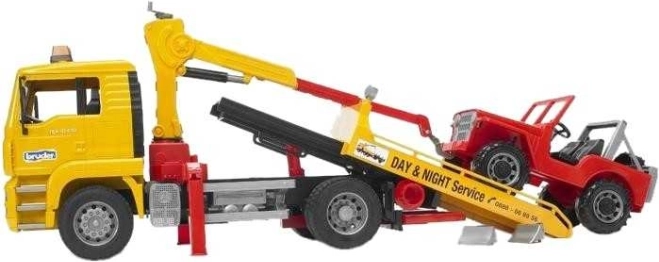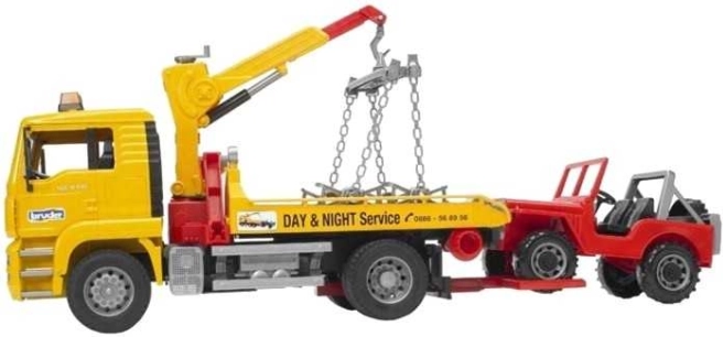 Il Bruder carro attrezzi MAN è il giocattolo ideale per i bambini che amano le simulazioni e giocare con modelli di auto realistici. Il veicolo offre una cabina ribaltabile che permette di vedere il vano motore, ed è dotato di un parabrezza anteriore in policarbonato resistente. Dietro la cabina si trova un braccio di gestione rotante con catene per una facile gestione del jeep.
