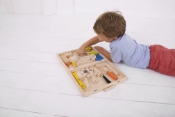 Fantastica valigetta degli attrezzi di legno per tutti i giovani appassionati di fai-da-te che desiderano sviluppare le loro abilità artigianali. Contiene martello, pinze, trapano e chiavi per dadi, tutto fatto con materiali di alta qualità.
