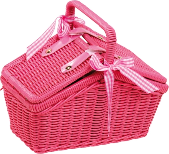 Questo cestino da picnic rosa è il compagno ideale per gite con le bambole e per i tè dei bambini. Il design moderno in stile anni '70 combinato con le stoviglie in metallo dal motivo floreale farà felici piccoli e piccole padrone di casa. Il cestino in vimini sintetico è sufficientemente spazioso per l’intero set di stoviglie e per piccole golosità.