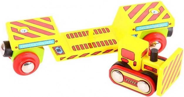 Questo set versatile offre il doppio del divertimento: i bambini possono giocare con il bulldozer separatamente oppure caricarlo sul robusto carro e trasportarlo lungo il tracciato. I ganci magnetici assicurano un facile collegamento con altri carri o con la locomotiva, così ampliare il vostro circuito è questione di un attimo.